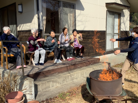 かじかの庭に出て毎年恒例のどんど焼きを行いました。 お正月に飾ったしめ飾りや書初め等を炊き上げ、無病…