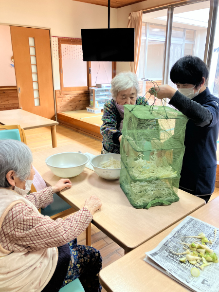 2月4日まなごの畑で採れた大根でかんぴょう作りを行いました。 皆で協力して大根を切ります。皮を剥いて…