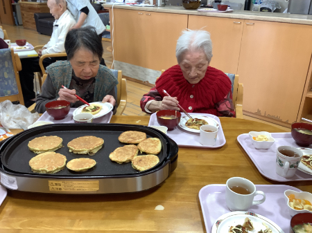 昼食にお好み焼きをホットプレートで焼いて食べていただきました。皆さん、目の前でお好み焼きを焼けるとこ…