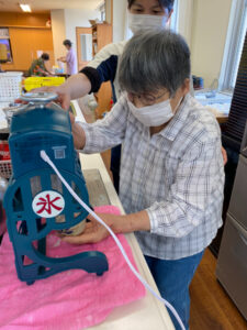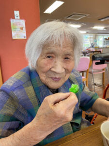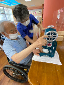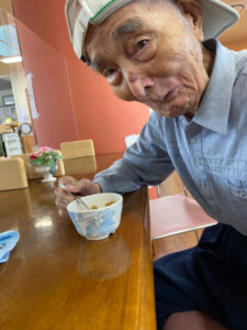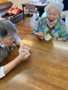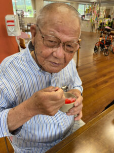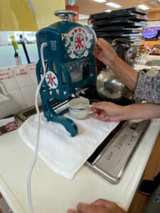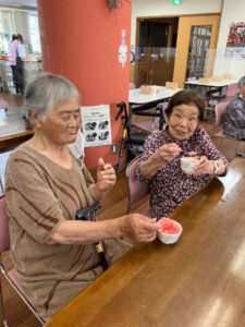 デイサービスでは13時のカフェの時間にコーヒー、ココア、梅昆布茶と選んでもらっています。天気が良く暑い日が続くため、カフェメニューにかき氷を追加しました。