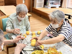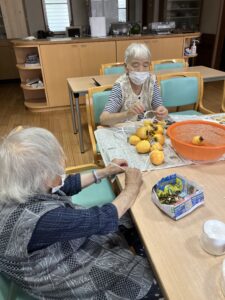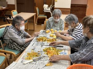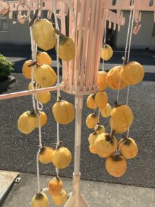 午後は数人で渋柿の皮剥きをして干し柿を作りました。