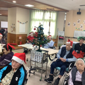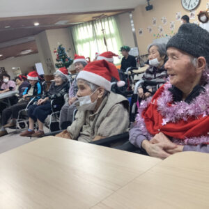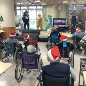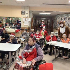 その後、クリスマスソングに合わせて皆さんで合唱をしていただき、それに合わせて職員が踊りを踊りました。大きな声が出て、とっても楽しい雰囲気でした。