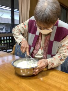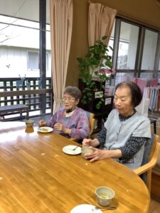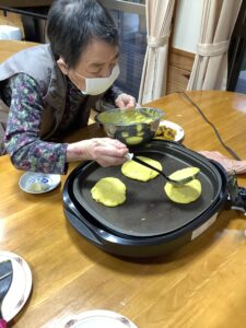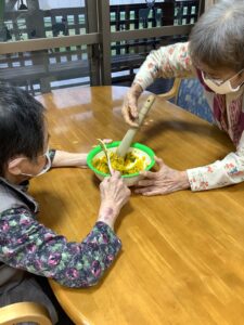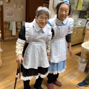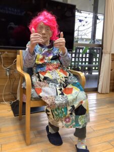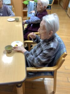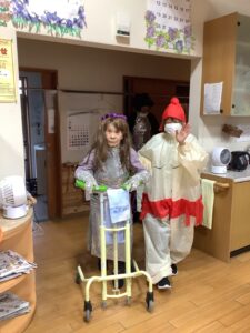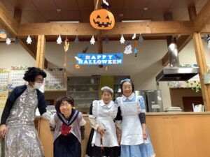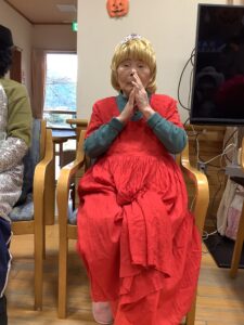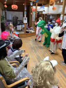 10月31日は、ハロウィンの日という事で、午前中はかぼちゃを使ったおやつを作りました。午後からはハロウィンパーティーを開催し、ご利用者様も職員も仮装をして仮装行列やハッピーパフォーマンスを行いました。仮装時、他の利用者様が着ている服を見て「あの服がいい」と言われる方もおられました。終わりには記念撮影をしてかぼちゃのおやつを食べました。みなさんとても良い表情で楽しまれました。