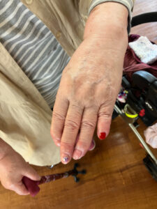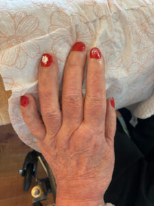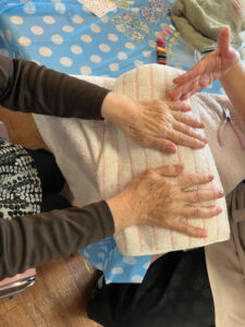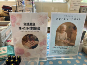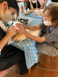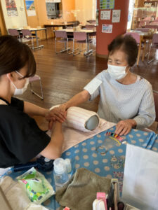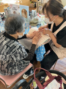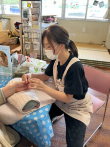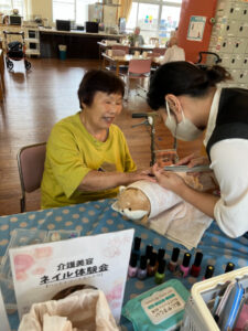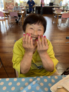 7月10日にハンドマッサージ・ネイル体験がありました。外部の福祉美容セラピストの方が2名来苑され、ハンドマッサージと爪のケア、ネイルをして下さいました。女性の方には大人気で「きれいになった」「うれしいねぇ」と大絶賛でした。