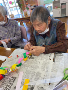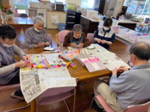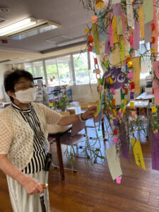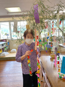 皆さんと一緒に飾りを作り、短冊にお願い事を書いていただきました。室内には短冊用の笹、玄関には飾り用の笹を準備して飾りつけもして頂きました。