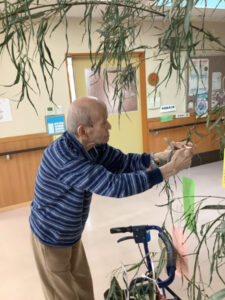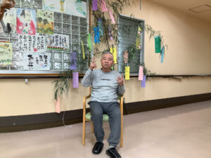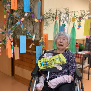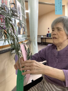 利用者様1人1人にお願いごとを書いていただきました。健康を願う短冊や好きな食べ物を食べたいという短冊、長寿を願う短冊と、様々なお願いが書かれた短冊を笹に飾りました。飾りは利用者様にも手伝って頂き作成を行いました。私たち職員は利用者様の願いを叶えられる様お手伝いが出来たら良いなと思います。