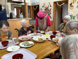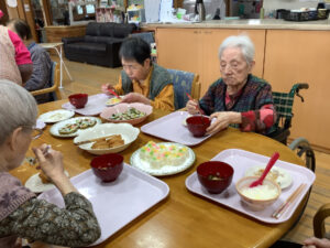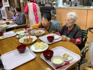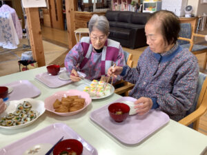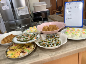 お寿司の数も豊富で、巻きずしにいなりずし、押しずしにちらし寿司、そしてお吸い物です。皆さん、好きなお寿司に箸を伸ばして美味しく食べられていました。