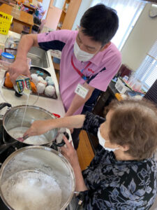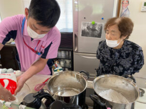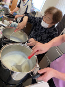 5月31日に手作りおやつで、ミルクきな粉くずもちを作りました。鍋に片栗粉、砂糖、牛乳を入れて火にかけながら混ぜていきました。