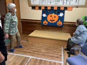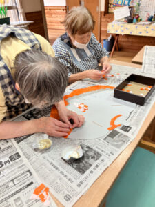 今回はハロウィンの貼り絵を制作しました。折り紙を手でちぎり皆さん丁寧に貼っておられます。