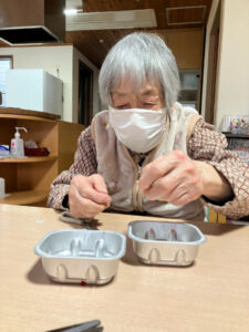 始めに梅の花から貼りました。やはりつぼみは小さいため貼るのが大変で、丸まったりのりをつけすぎたりとみなさん苦労されていました。