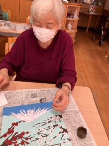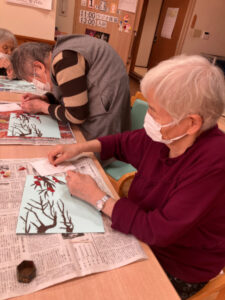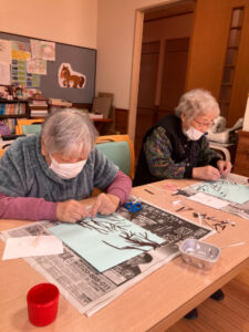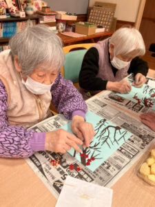 1月16日には講師の先生に書いていただいた下絵に沿って梅の木と枝を貼りました。枝を細くしたり先を尖らせたりとみなさん工夫しながら貼っておられました。