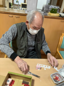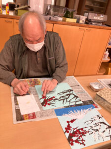 始めに梅の花から貼りました。やはりつぼみは小さいため貼るのが大変で、丸まったりのりをつけすぎたりとみなさん苦労されていました。