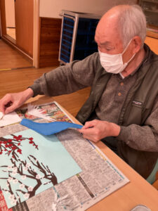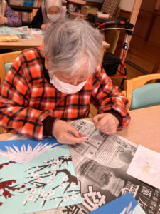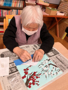 1月16日には講師の先生に書いていただいた下絵に沿って梅の木と枝を貼りました。枝を細くしたり先を尖らせたりとみなさん工夫しながら貼っておられました。