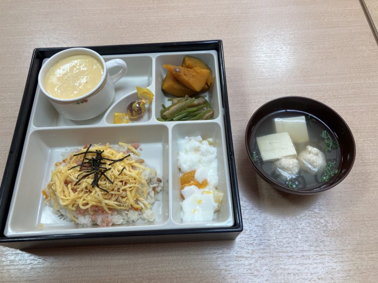「ちらし寿司・茶わん蒸し・カボチャの煮物・芋の茎煮・吸い物・牛乳かん」