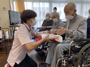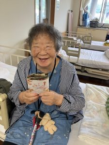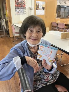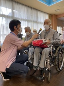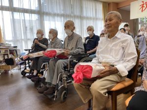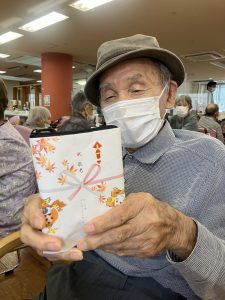 デイサービスからのプレゼントをお渡しすると「まぁこんなに。ありがとう」とうれしそうに受け取って下さり、最高齢者挨拶では、有難いお言葉をいただきました。