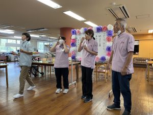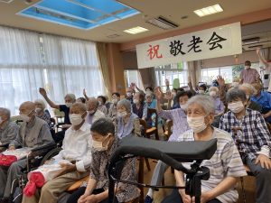 9月16日にデイサービスセンターの敬老会を行いました。今年の最高齢者は99歳の女性1名、97歳の男性2名の方でした。