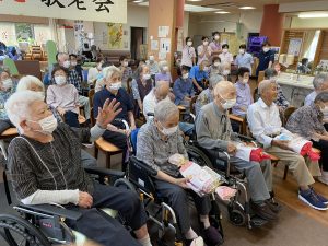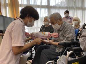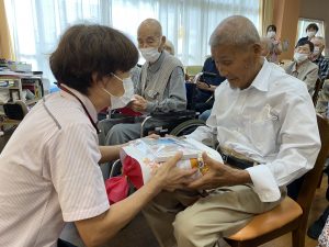 デイサービスからのプレゼントをお渡しすると「まぁこんなに。ありがとう」とうれしそうに受け取って下さり、最高齢者挨拶では、有難いお言葉をいただきました。