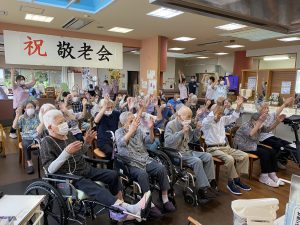 9月16日にデイサービスセンターの敬老会を行いました。今年の最高齢者は99歳の女性1名、97歳の男性2名の方でした。