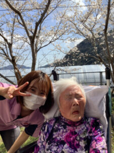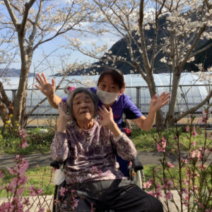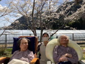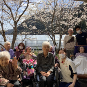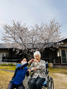 当初は桜を愛でながらお茶会もする予定でしたが、思いのほか風が強かったため急遽予定を変更して職員と一緒に写真撮影のみ行いました。
