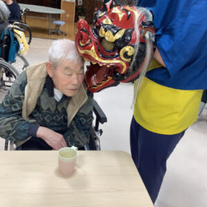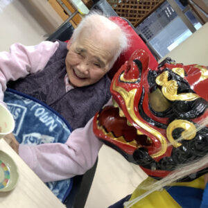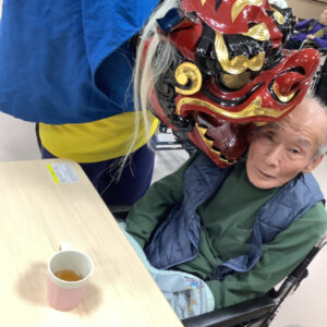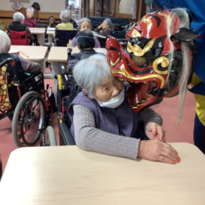 獅子舞が来ると「悪いところを噛んでもらわんといけん」と腕を差し出したり、「頭を噛んで」と言われる方もいらっしゃいました。始めは「怖い」と言う方もいらっしゃいましたが、少し経つと慣れたのか、「獅子舞さんおいでよー」と手招きされておられました。