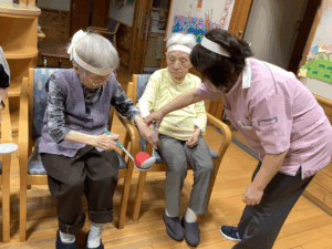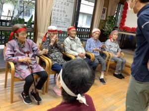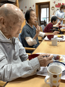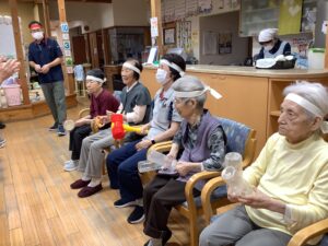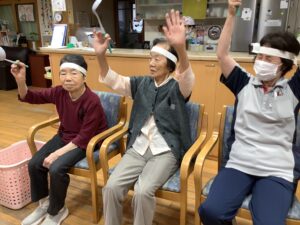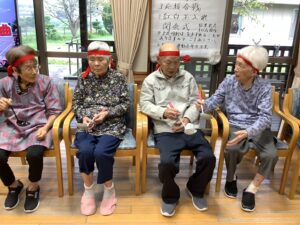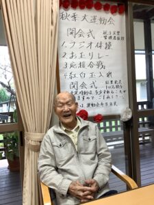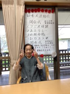 10月3日にかじかの里の秋季大運動会をしました。開会式では選手宣誓を利用者の方にお願いすると、始めは「他の人に」と言われていましたが、いざとなると堂々と選手宣誓をされました。ラジオ体操後は、お玉リレー、応援合戦、紅白玉入れを行いました。皆さんどの競技もチーム一丸となって懸命にされていました。運動会が閉会して昼食は運動会弁当を食べられご満悦でした。