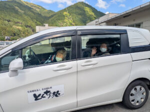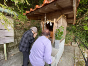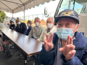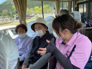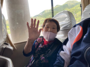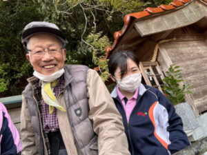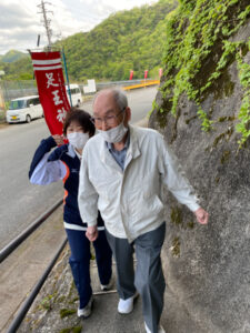 5月1日に船路の足王様へ行きました。近所でもなかなか足を運びづらいという方が多く、「行きたかったから助かった」「1回は行ってみたいと思っていたから、良かった」と喜んでいらっしゃいました。足王様へ行くとお接待をして頂いた地域の方からも「〇〇さんに会えてうれしかった」「元気そうな顔が見られて安心した」等の声があり、皆さん笑顔で過ごすひと時となりました。お参りもしましたが、階段を上がって拝む方とお賽銭を職員に渡して下から拝む方といらっしゃいました。皆さん少しでも足が良くなりますように(―人―)