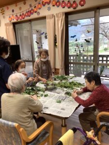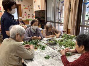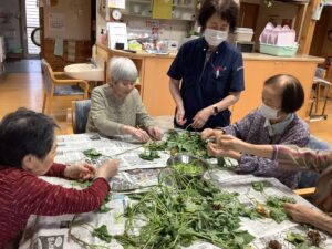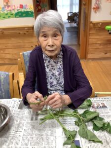 昨日、芋掘り大会をしてさつま芋のツルを今日は皆で皮むきをしました。「昔はこの皮をむいで煮て食べよたんよ」と入所者の方が言われておられるのを職員が聞き「皮をむいで
