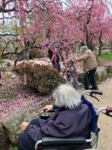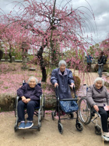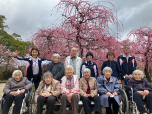 次に防府天満宮へしだれ梅を見に行きました。数人は本殿に「めったにこんから」とお参りをされていました。梅は満開で、みなさん歓声を上げ散策されていました。