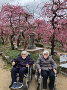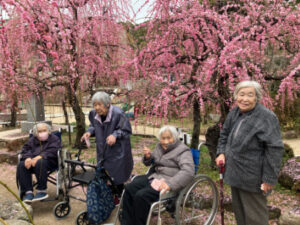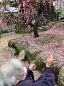 次に防府天満宮へしだれ梅を見に行きました。数人は本殿に「めったにこんから」とお参りをされていました。梅は満開で、みなさん歓声を上げ散策されていました。