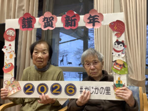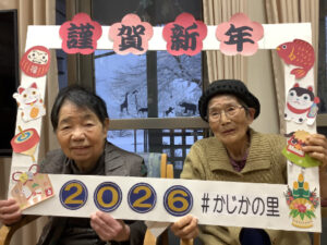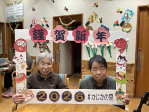 職員がこしらえた謹賀新年のフレームを持っていただき、今年初めての写真撮影をしました。