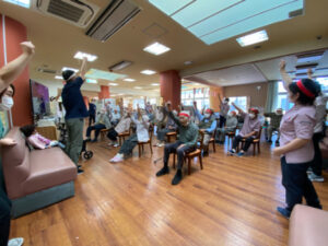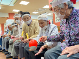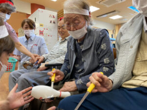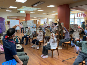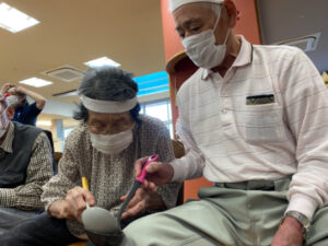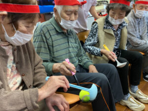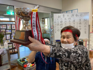 10月10日にデイサービスで秋季大運動会を行いました。準備体操から始まり、代表の方2名による選手宣誓をしていただき、皆さんで「えいえい、おー」と気合いを入れて競技へ移りました。