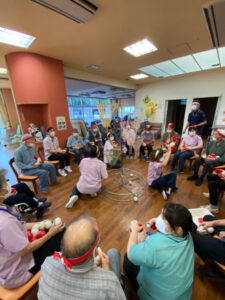 競技では、毎年恒例の玉入れとお玉リレーを行いました。玉入れでは1分間でどれぐらい玉を入れられるかを競いました。「肩が上がらんからのー」と言われていた方も手首を上手に使って球を投げておられました。「よいしょ、よいしょ」と掛け声をかけながら投げておられる方もおられ、大変盛り上がりました。結果は、127個対76個で紅組の勝ちでした。2回戦は職員も入りましたが、なかなか紅組に勝つことができませんでした。