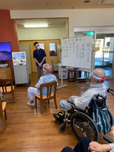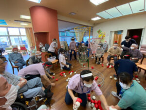 競技では、毎年恒例の玉入れとお玉リレーを行いました。玉入れでは1分間でどれぐらい玉を入れられるかを競いました。「肩が上がらんからのー」と言われていた方も手首を上手に使って球を投げておられました。「よいしょ、よいしょ」と掛け声をかけながら投げておられる方もおられ、大変盛り上がりました。結果は、127個対76個で紅組の勝ちでした。2回戦は職員も入りましたが、なかなか紅組に勝つことができませんでした。