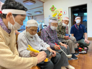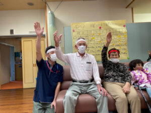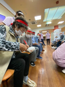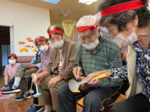 10月10日にデイサービスで秋季大運動会を行いました。準備体操から始まり、代表の方2名による選手宣誓をしていただき、皆さんで「えいえい、おー」と気合いを入れて競技へ移りました。