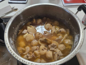 味付けはシンプルに砂糖、みりん、醤油、鶏肉と一緒にじっくりコトコトと煮込んでいきます。