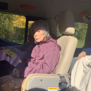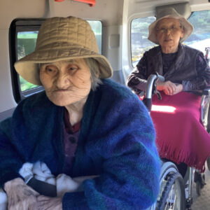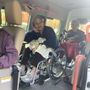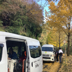 車に乗り込みいざ出発!天気にも恵まれ、青々とした空の下で紅葉を見る事ができました。少し肌寒かった為、車内からの見物になりましたが、口々に「綺麗」や「ここ懐かしい」という声が上がりました。本格的に寒くなる前に外出する事が出来て良かったです。