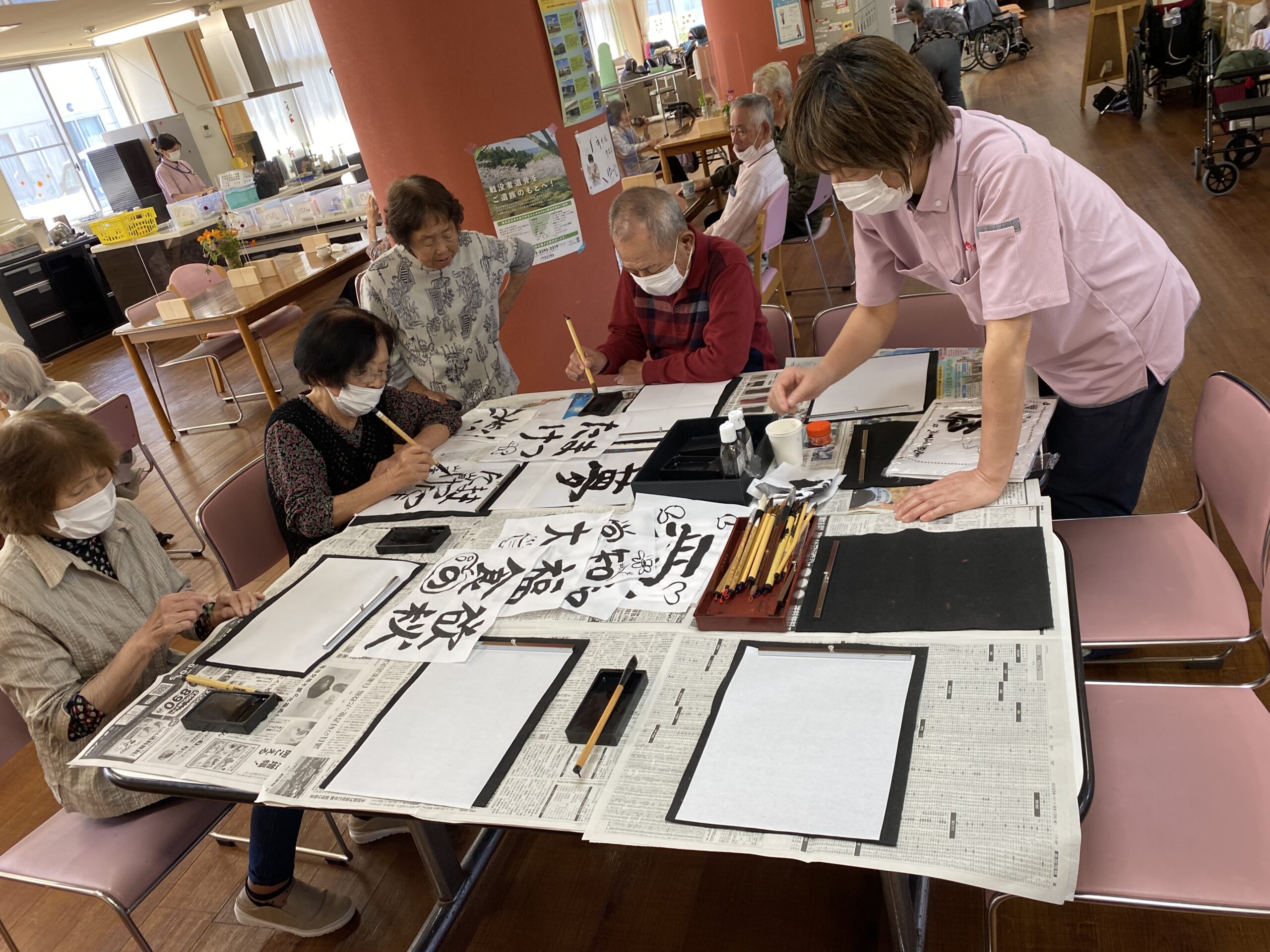 10月9日にレクリェーションで書道を行いました。 「久しぶりに書く」「なんて書こうかねぇ」「ちょっと…