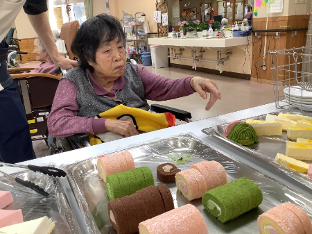 5月7日にケーキバイキングを行いました。 利用者様に机いっぱいに並べられたケーキの中から好きなケーキ…